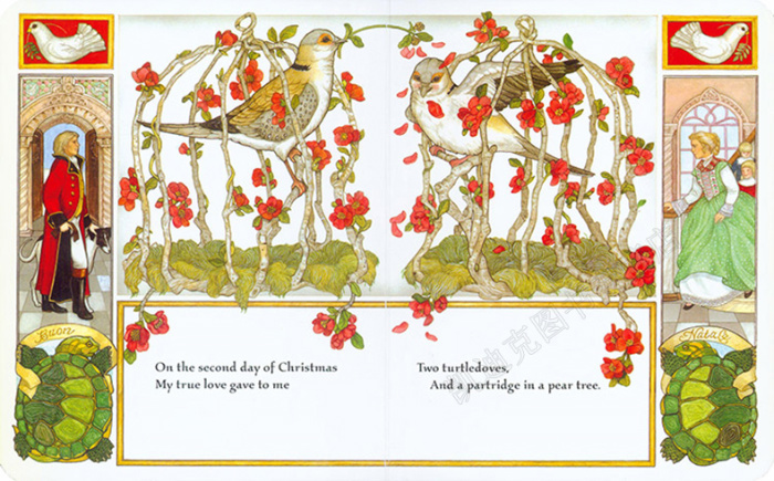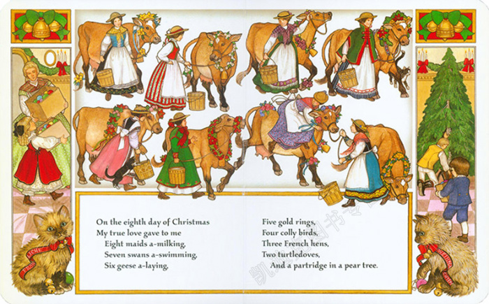 书中的歌谣十分可爱,适合启蒙,看似没有太多含义,其实寓意深远,还有着宗教渊源哦。这是一首叠加式的歌曲,后面的每一节歌词都是在前一节的基础上进行添加,重复式歌词更符合孩子学习的特点。本书不仅可以让孩子知道圣诞节十二日里应该做些什么事,认识许多漂亮的动物,还能在不经意间培养孩子对数字的敏感度。书中插图形象逼真,色彩丰富,而且线条非常柔和,相信对小朋友们很有吸引力。
