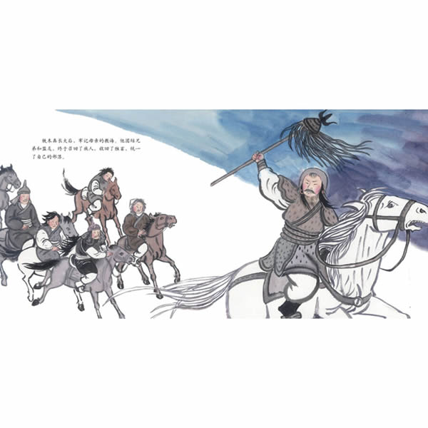 成吉思汗,一代民族英杰,马背上诞生的天之骄子,为小读者树立了成长励志、开拓进取的一流楷模。在这本图画书中,一幅幅大草原的风景画和古朴的蒙古风情将小读者引入胜境,随同主人公一起感悟成长的要义。鹰击长空,鼓动着小英雄理想的翅膀跃跃欲升;骏马穿疾,驾引着小英雄梦的希冀奔腾不息;一股英雄豪气,荡气回肠,在蒙古大草原浩渺辽阔的历史原野中驰骋纵横。