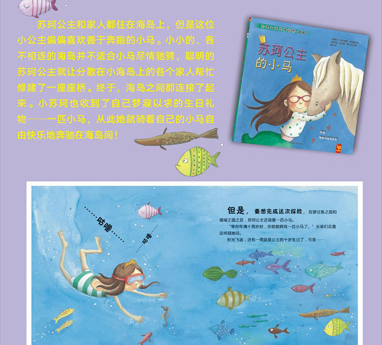 苏珂公主和家人都住在海岛上,但是这位小公主偏偏喜欢善于奔跑的小马。小小的、四散不相连的海岛并不适合小马尽情驰骋,聪明的苏珂公主就让分散在小海岛上的各个家人帮忙修建了一座座桥,终于,小海岛们都连接了起来。小苏珂也收到了自己梦寐以求的生日礼物——一匹小马,自由快乐地奔驰在海岛间!