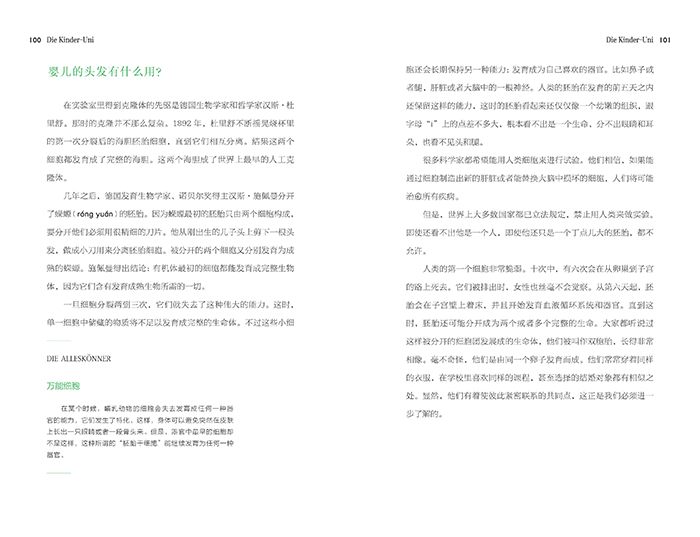 在图宾根儿童大学里,包括诺贝尔奖得主在内的权威、的科学家们亲自担纲为8~12岁的“小大学生”们授课,他们用浅显易懂、风趣幽默的语言,专业地、多角度地、深入浅出地讲述孩子们关心的那些上至天文下至地理的问题,而我们目前出版的三册书则是儿童大学前三个学期的课堂内容,由《施瓦本日报》的两位资深编辑——乌尔里希·扬森、乌拉·施托伊尔纳格尔汇集成书,邀请德国“书籍插图的无冕之王”克劳斯·恩西卡特绘制插图。 这套书的特色是每一章的问题都由孩子们自己提出来,这样就提高了孩子的课堂参与性,也提高了他们对授课内容的关注,同时也促使孩子们对晦涩难懂的科学知识产生兴趣。