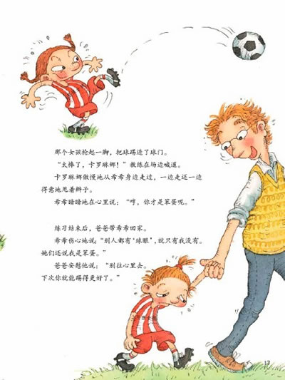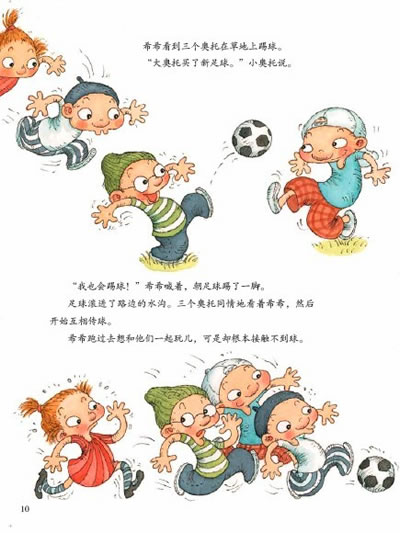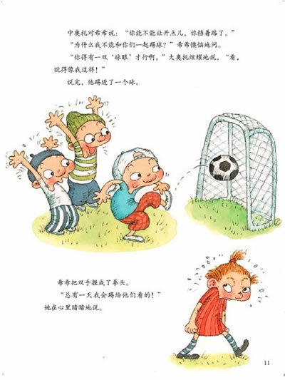 大奥托、中奥托和小奥托玩起了足球。希希也想和他们一起踢球,可是三个奥托都觉得希希缺少一双“球眼”。希希感到受到了伤害,于是她加入了一个叫做“坚强女孩”的球队,想让三个奥托也看看她的本领。希希在球队里个子最小,球场上,她总是碰不到足球。队里的明星队员卡罗琳娜更是不客气地问希希:“你是哪里来的小不点儿?”“坚强女孩”马上要和一个叫做“闪电女生”的球队比赛了,希希决定退出。然而,小奥托却鼓励她不要放弃,并秘密传授给她一招绝技。比赛还有一分钟就要结束了,小奥托传授的招数管用吗?希希能不能展示出自己的水平呢?本册是“顽皮希希系列”的第九本。希希是个好强的女孩,但是这次参加足球队却让她胆怯了,退缩了。关键时刻,小奥托帮助她战胜了自我,希希又一次成功了!