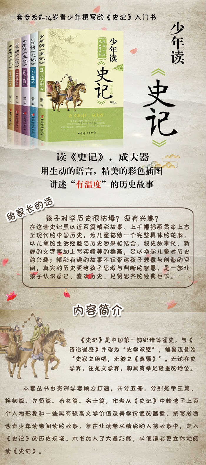 本套丛书由资深学者倾力打造,共分五册,分别是帝王篇、将相篇、先贤篇、布衣篇、名士篇,作者从《史记》中精选了上百个人物形象和一些具有较高文学价值及美学价值的篇章,撰写成适合青少年读者阅读的故事,旨在让读者从精彩的人物故事中,走入《史记》的