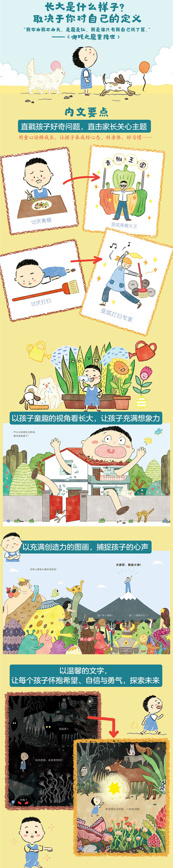 “长大是什么样子?” 不必等到长大,现在就可以来一探究竟! 以孩子的视角诠释对于长大的想象, 长大以后,可以做到哪些事? 长大的我,还会害怕吗?还会讨厌现在讨厌的事吗? 也让已经长大成年的大人们停下脚步想一想, 长大以后的你,有没有忘记一些事情呢? 未来是不是如同小时候想的那么有趣、那么令人向往呢? 愿每个孩子都能怀抱着希望与勇气,像闪耀的星星,在探索未来的每条路之际,快乐长大!