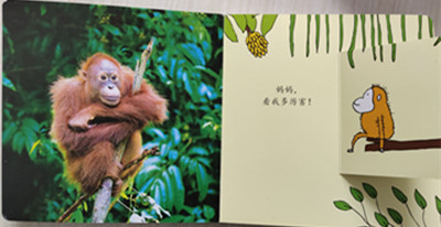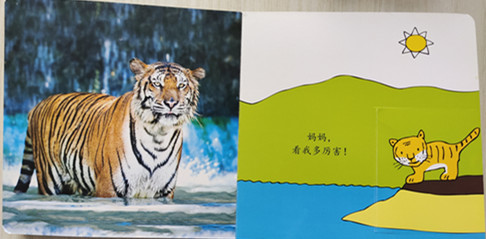 书中的设计非常好,是纸板书。不同与一般的低幼动物书,形象都是卡通设计。书中,爸爸的形象是真识的动物实图,同一开张里的宝宝则是简笔画的形像。这样的设计也更容易让宝宝认识动物。同系列还有《爸爸,你看我多厉害》