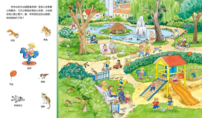 .动物、交通工具、幼儿园、孩子的日常生活、城市、节日等6大方面内容,近百个日常生活场景,1000多个视觉搜索目标,丰富的内容,反复、多角度锻炼孩子的观察力和专注力!