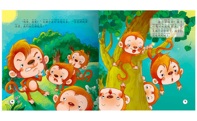 本册内容为《猴子捞月》。故事讲述了一群贪心的猴子发现月亮又明亮,又美丽,想把它占为己有。结果它们用了各种方式,最后都没能捞到水中的月亮。这个故事告诉我们,遇到事情要多动脑筋,认真观察,仔细思考。不能像猴子那样不切实际,自作聪明,到头来只是竹篮打水一场空。