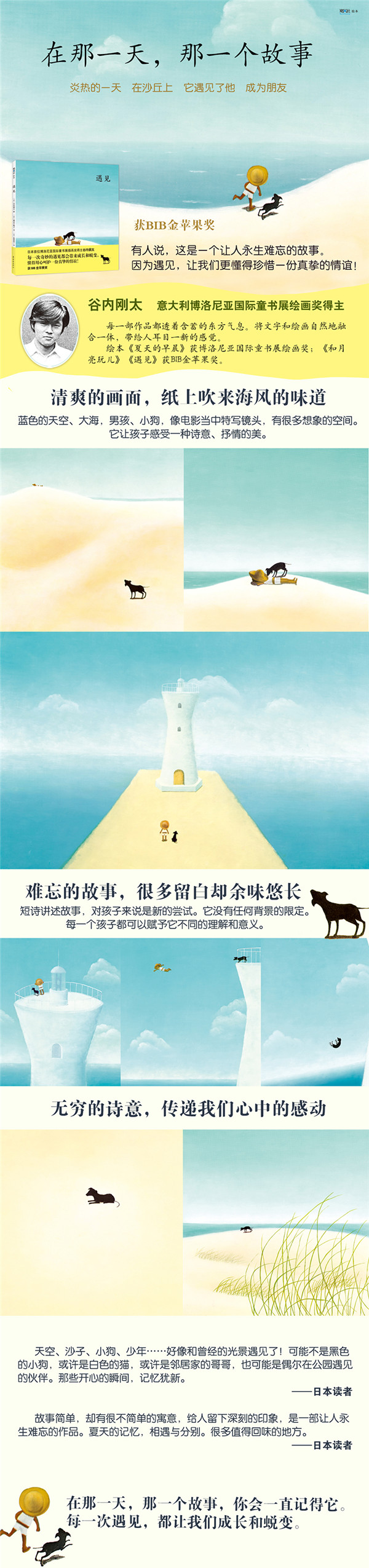 ★布拉迪斯拉发绘本原画展BIB金苹果奖、东京艺术总监俱乐部ADC奖。 ★天空、大海,沙丘、男孩和小狗,很多余白却意味深长、充满诗意,是一部让人永生难忘的作品。 ★时间和距离都无法丈量它,只有心与心的铭记,我们才真正明白了“遇见”的意义。