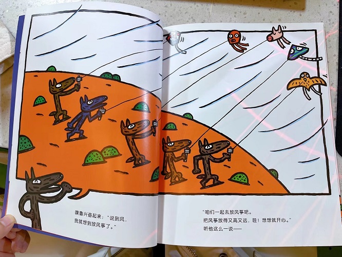 有5只狼是好朋友。一天,风和日丽,一只狼想骑自行车,一只狼想放风筝,一只狼想睡午觉,一只狼想爬山,最后那只狼说,那我们把这些事情都做一遍吧!众狼欢呼:“这个主意棒呆了!”......