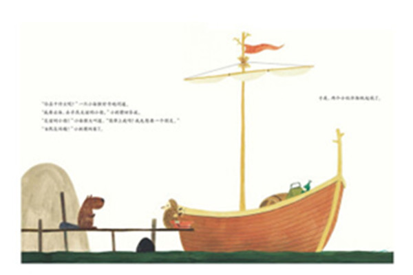 刺猬想象着友谊的小船上有各种各样的朋友,马上就驾船去了海上。她一路寻找,不断遇到别的孤单的动物加入她的队伍。