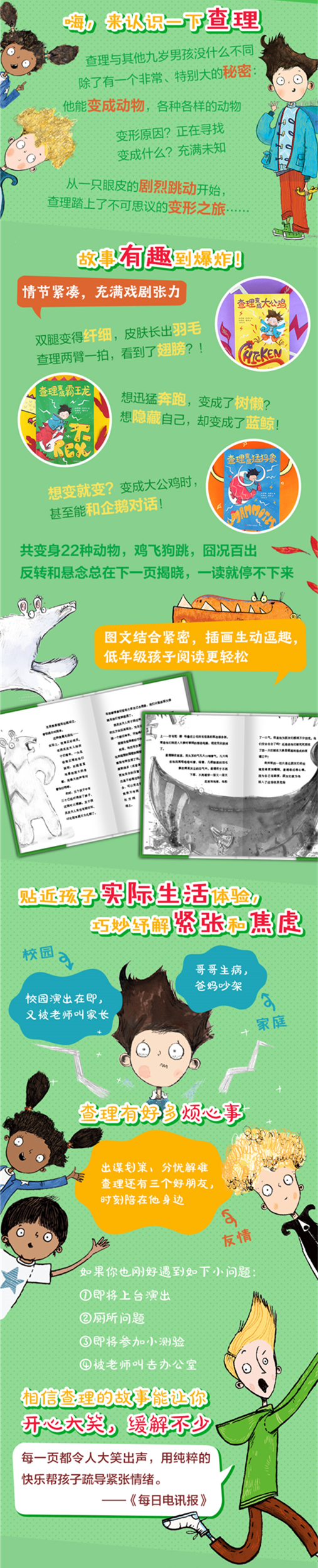 极尽搞笑之能事,主题又十分积极,每一页都能为你带去欢乐。——水石书店 每月图书 如果你有认识的孩子,请买给他们,他们将会永远爱您(或至少爱一会儿)。如果你不认识任何孩子,就请为自己买一本吧。——读者Joseph Elliott 这本书真的会令人笑出声来。我很理解查理遇到的困难,也经常体验那种紧张的感觉。我喜欢书中所写如何减缓紧张的方法。——读者Jenny Holder