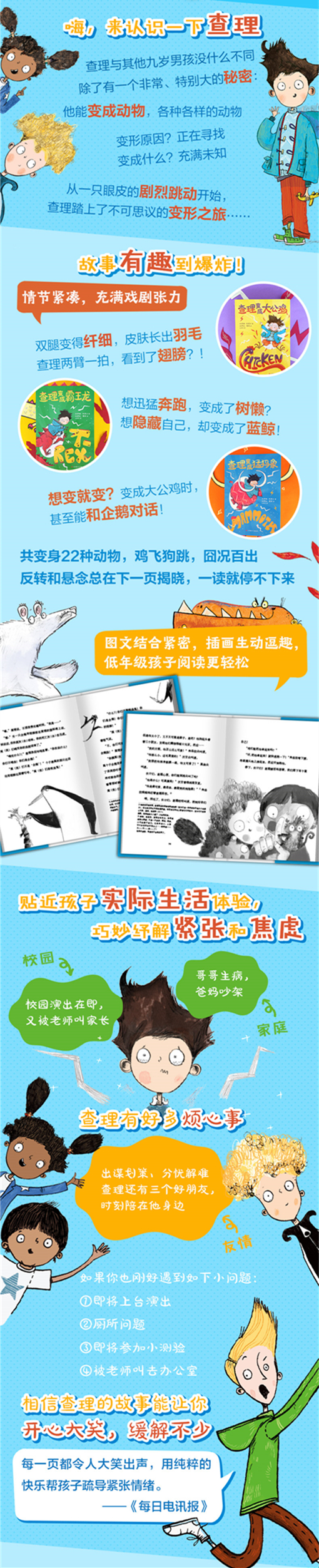 极尽搞笑之能事,主题又十分积极,每一页都能为你带去欢乐。——水石书店 每月图书 如果你有认识的孩子,请买给他们,他们将会永远爱您(或至少爱一会儿)。如果你不认识任何孩子,就请为自己买一本吧。——读者Joseph Elliott 这本书真的会令人笑出声来。我很理解查理遇到的困难,也经常体验那种紧张的感觉。我喜欢书中所写如何减缓紧张的方法。——读者Jenny Holder