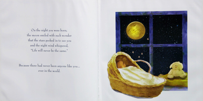 作者南西.蒂尔曼说她创作这个故事的目的之一,是要将“你是独一无二的”这个讯息,及早传达给年幼、敏感的儿童。在这本书里,南西用一些平日常见的事物,像是飞鹅、瓢虫,还有终夜高挂在空中的月亮来庆贺新生命的诞生。她希望孩子们即使在长大成人后,还是能够因为看到这些事物,而感觉到自己很重要。