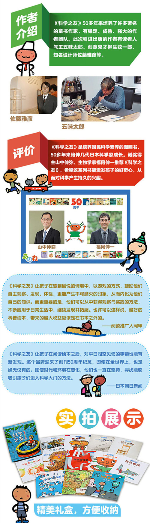 “科学之友”在科学主题和内容覆盖上非常全面。这套书拥有超强的创作阵容,吸引了包括五味太郎、佐藤雅彦在内的、一大批日本知名作家、画家、科学家、教育家共同参与,为孩子们悉心打造出一个个富有情趣的、细腻生动的好故事。 “科学之友”巧妙结合了科学性、人文性和艺术性,帮助幼儿开启探究外部世界和认识内部世界的眼睛,同时也为孩子们插上一对想象的翅膀,在科学与幻想间自由驰骋,在文学和艺术中尽情欢愉。值得亲子共读,也适合在幼儿园和学校科学活动中广泛运用。