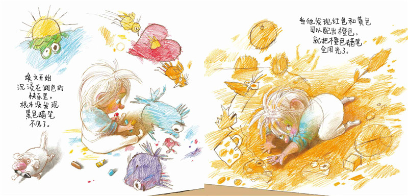 因为丢失了一支绿色蜡笔,埃文发现了调色的秘密,蓝色与黄色相遇,诞生了绿色;红色和黄色相遇,制造出橙色,红色和蓝色相遇,制造出紫色……孩子们最感兴趣的色彩认知内容,也在埃文与蜡笔的小博弈中传递出来,显示出作者高明的故事编织技巧。