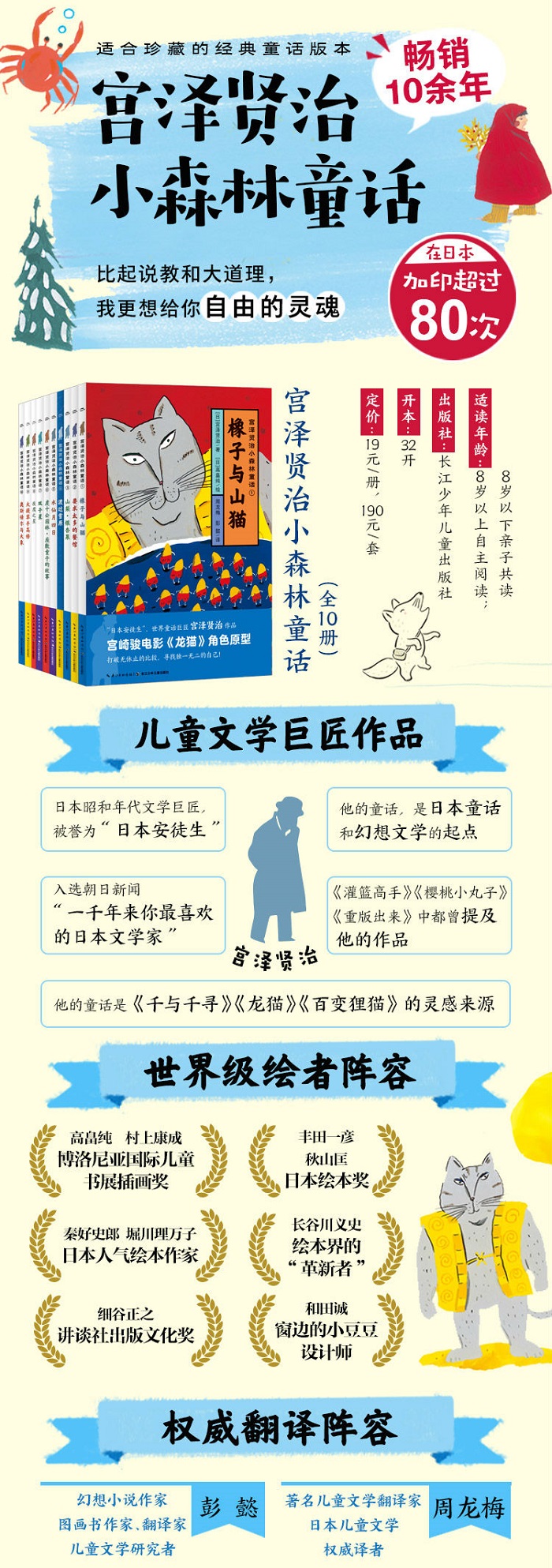《宫泽贤治小森林童话》从宫泽贤治超过100篇童话中,精选了12个适合6-10岁阅读的童话故事,并特别邀请了10位日本当红绘本大师为图书进行插画,包括《窗边的小豆豆》设计师、博洛尼亚特别奖得主、日本绘本大奖得主等多位在国际上有较高知名度的作者,整套图书充满了艺术性与想象力。同时,本书中文译本邀请了日本儿童文学专家彭懿为每篇童话撰写导读,帮助家长和小朋友理解童话之美。
