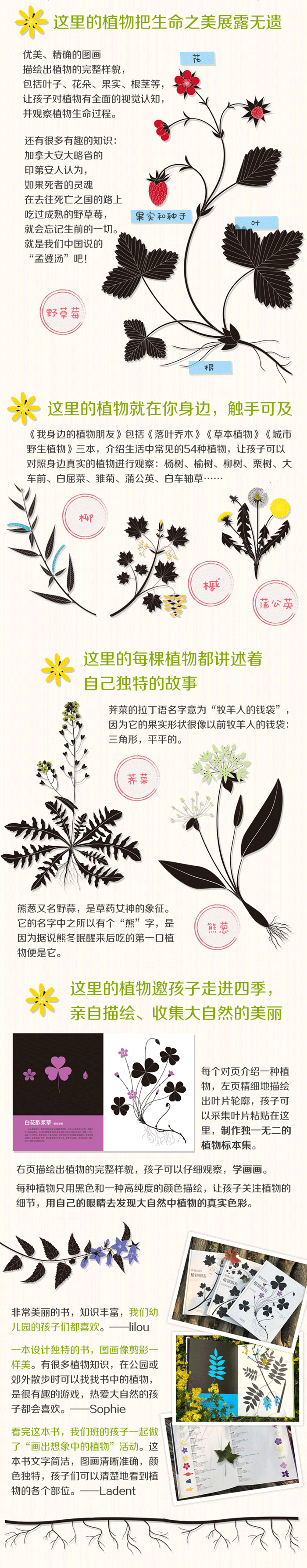 埃米莉•瓦斯特创造了一个真实而科学的植物标本馆,它简明、生动、充满诗意……向孩子们展示了大自然的丰富多彩,指导孩子们辨认植物,教会孩子们尊重自然。——博洛尼亚国际童书展评奖委员会 我把这本书送给喜欢植物的女儿。书里每个对页介绍一种植物,一面有文字,另一面可以贴捡到的叶子等。图画非常美。——posilippo 非常美丽的书,知识丰富,我们幼儿园的孩子们都喜欢。——lilou 一本设计独特的书,图画像剪影一样美,而不像普通的植物书那样用照片或写实的图画。书中提供了很多植物知识,在公园或郊外散步时可以找找书中的植物,是很有趣的游戏,热爱大自然的孩子都会喜欢。——Sophie 看完这本书,我们班的孩子一起做了“画出想象中的植物”活动。这本书文字简洁,图画清晰准确,颜色独特,孩子们可以清楚地看到植物的各个部位。——Ladent