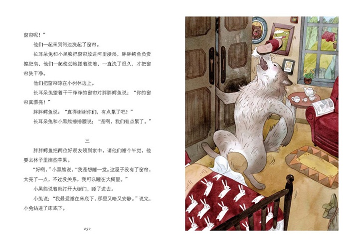 河马先生房里好像有两个妖怪在打架,房顶上的草到处掉,板壁颤动,墙上的镜框也跳动,好可怕。刺猬和豪猪夜里捉妖,捉到的是河马,原来河马的呼噜声震天响。有趣不?