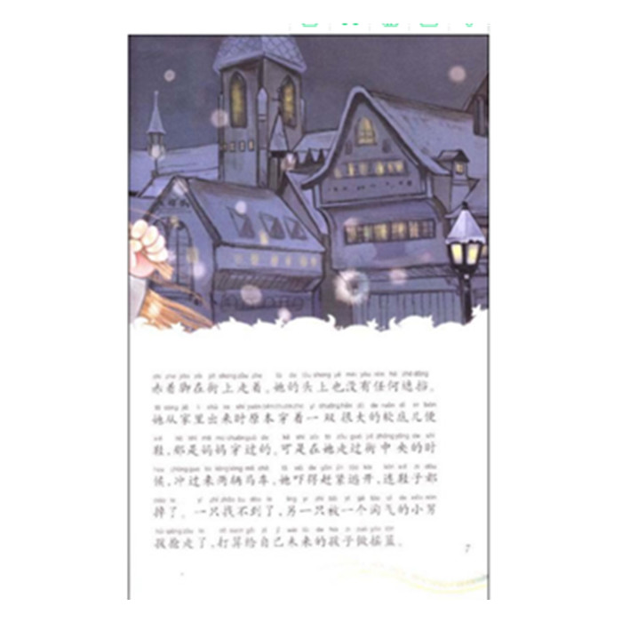 小女孩找了一个墙角坐了下来,冷得缩成一团,然而她更加冷了。她没卖出一根火柴,没挣到一个铜板。她怕爸爸会打她,不敢回家。回到家里也不会暖和多少,家里空荡荡的,冷风从破旧的屋顶上嗖嗖地灌进来。她的两只小手已经被冻麻了。“哎呀,或许点根火柴会暖和些。”她想。