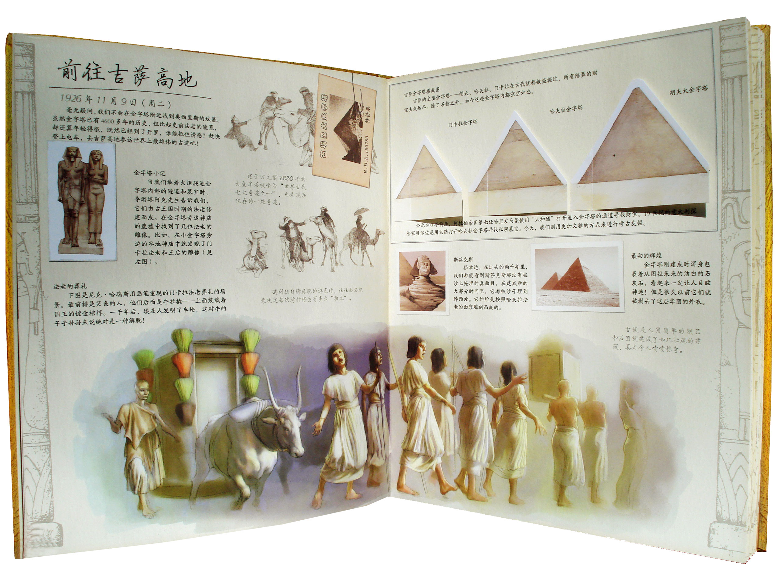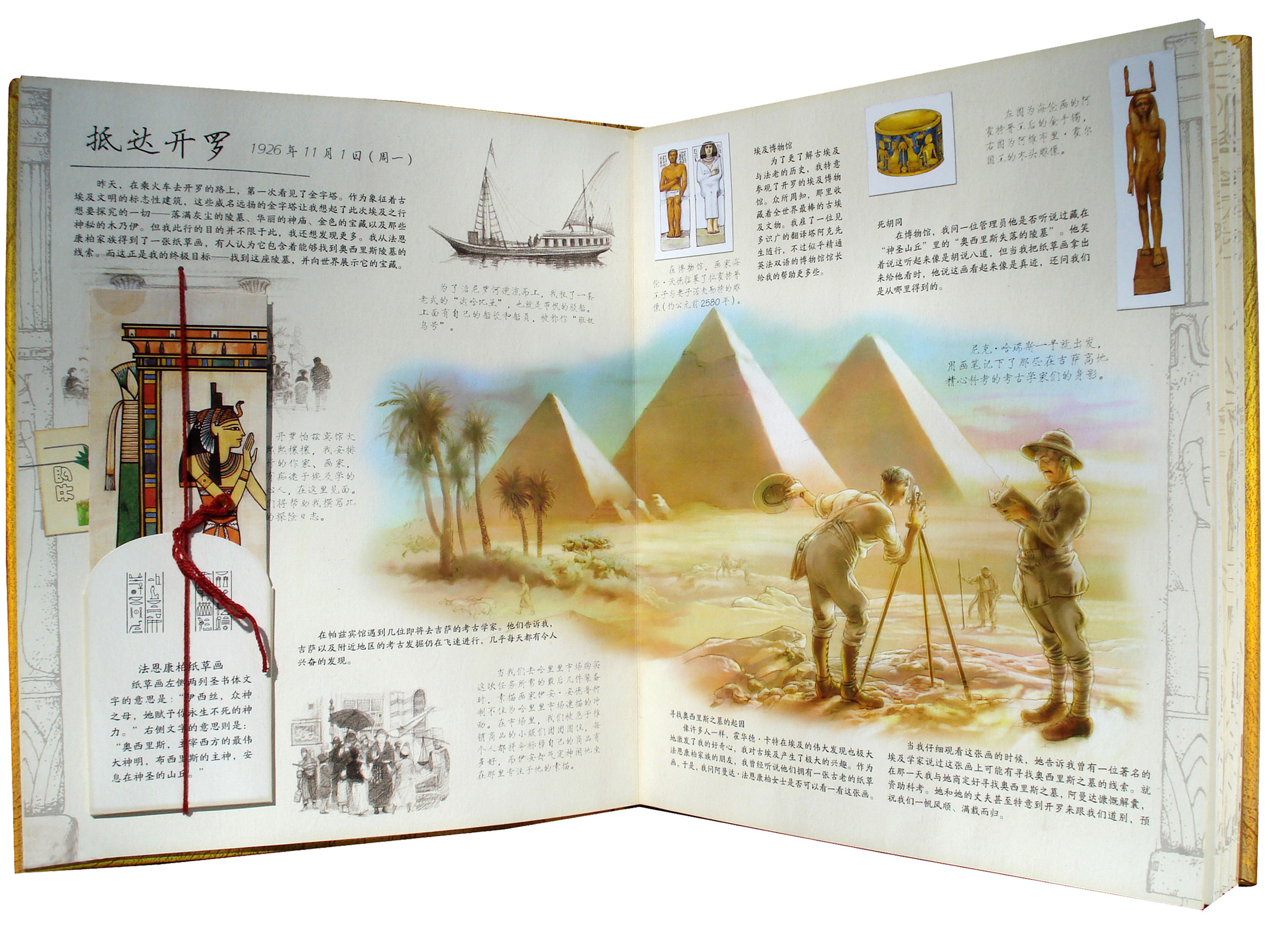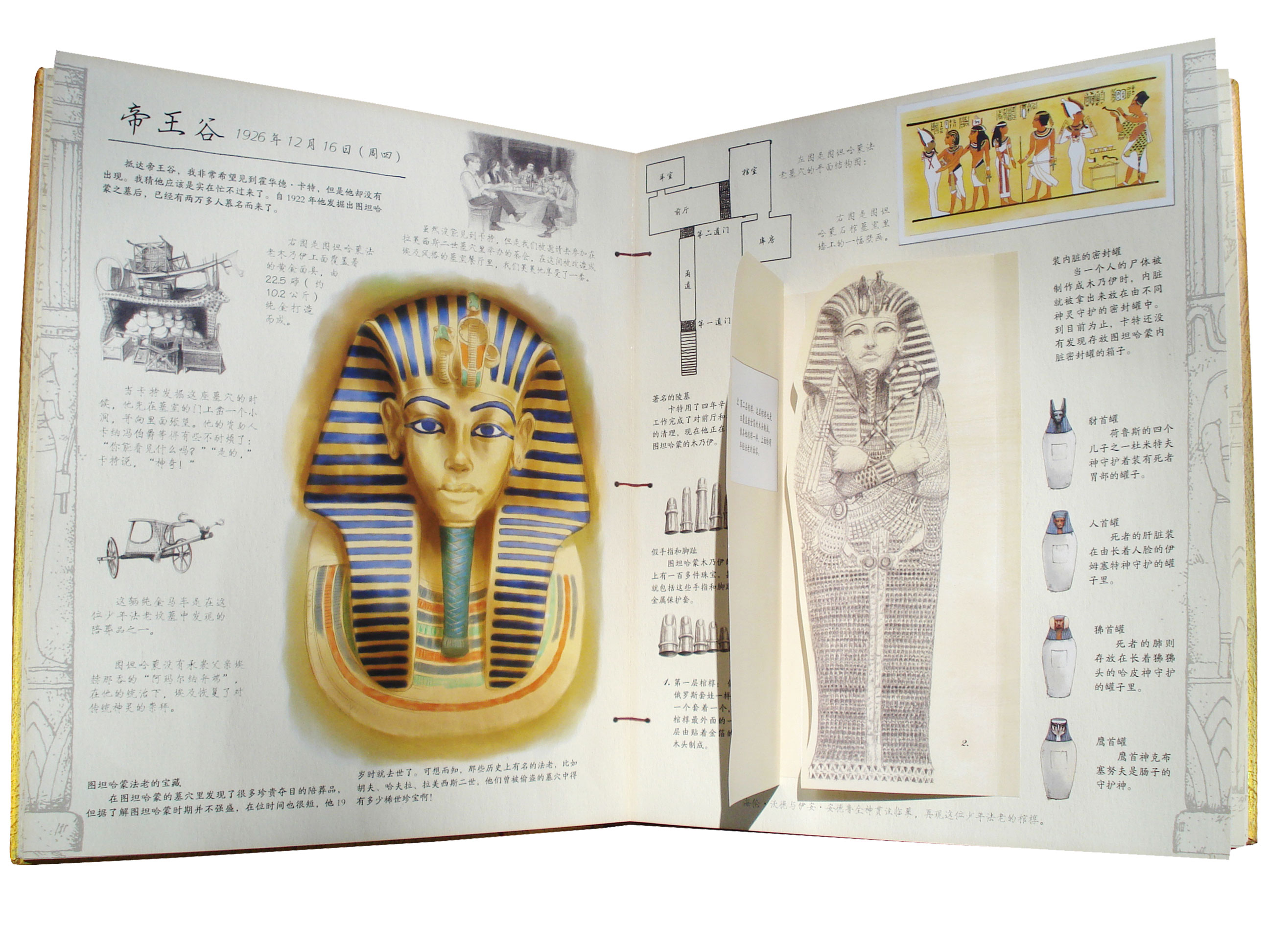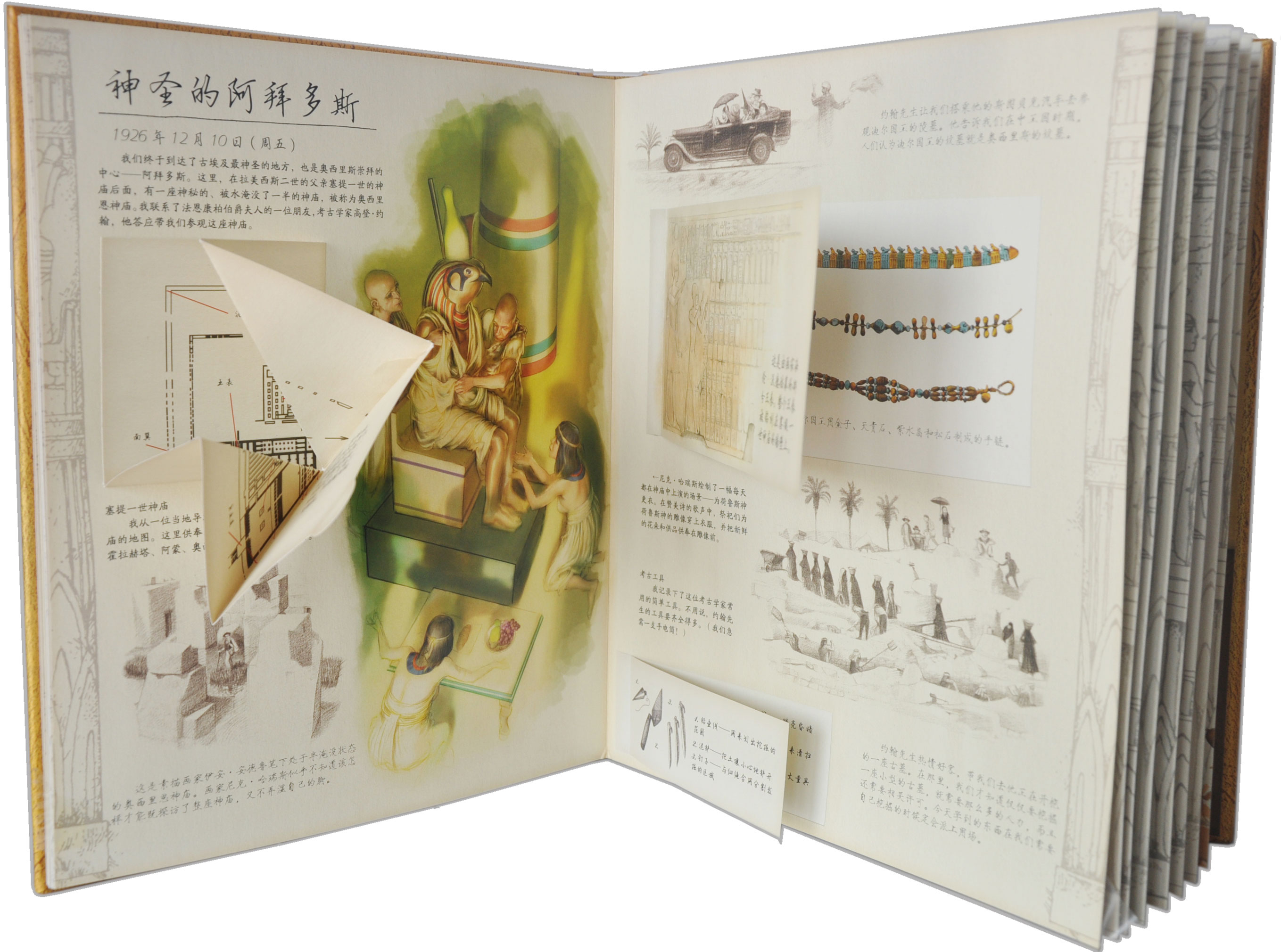 在设计上,可以说是“跳”出来的故事。日志中谈到的内容,都以立体方式呈现,可以展开(木乃伊的棺椁层次展示)、可以触摸(木乃伊的裹尸布)、可以看(奥西里恩墓穴的展示图),还可以玩(古埃及人玩的塞纳特棋)。工艺繁多,值得珍藏。