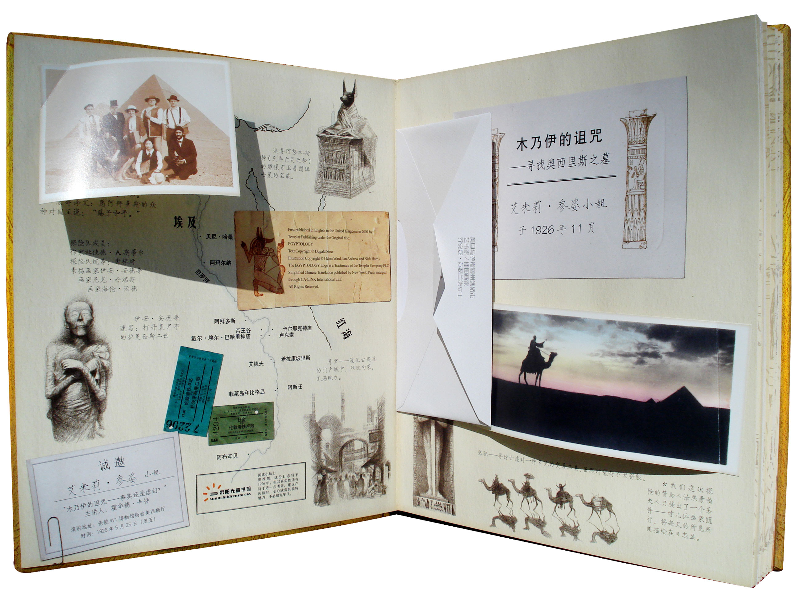 这个大开本的科普童书封面全部裱金,上面镶嵌着红色的塑料“宝石”,增强了故事的神秘色彩。日志属于1926年到埃及探险的考古爱好者艾米莉 参姿,每页的设计都有一小块展示古埃及特色的插件,而主体内容是详实的历史人文知识。同时,也有日志特色的主人公的心里话。日志中,文字由打字机字体显现,配上手写体旁白,图片又多是采用了素描风格,很完整地再现了20世纪20年代的风貌。值得一提的是,日志中的插件、明信片、信件,构思巧妙,也是一个学习游记写作的好范本,不过记得保管齐全啊!
