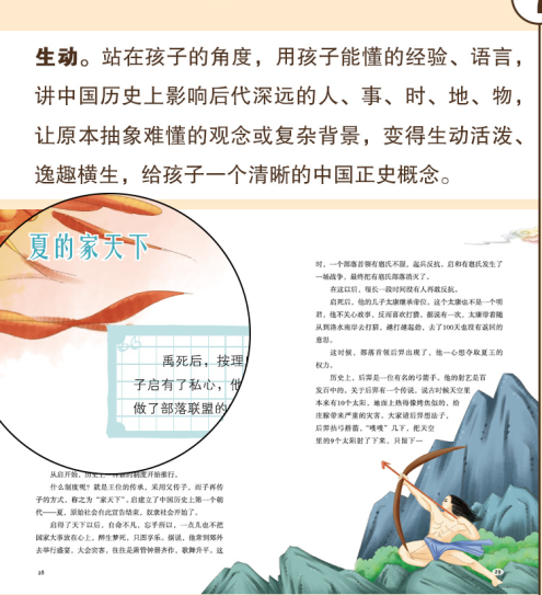 生动。站在孩子的角度,用孩子能懂的经验、语言,讲中国历史上影响后代深远的人、事、时、地、物,让原本抽象难懂的观念或复杂背景,变得生动活泼、逸趣横生,给孩子一个清晰的中国正史概念。
