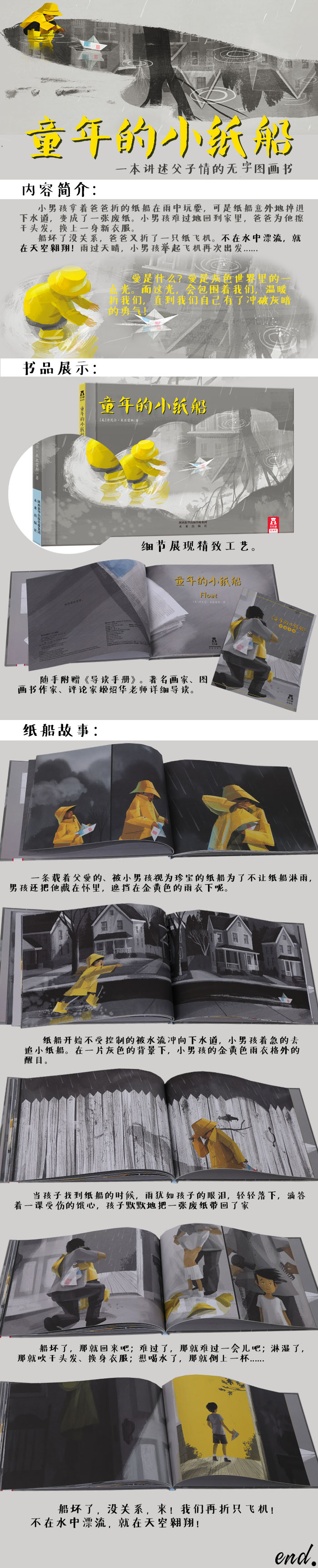 《童年的小纸船》是在一片灰色的背景中开始的。随着故事的推进,我们渐渐明白:一条载着父爱的、被小男孩视为珍宝的纸船(为了不让纸船淋雨,男孩还把它藏在怀里,遮挡在金黄色的雨衣下呢),不小心被雨水冲刷、浸泡,变回了纸片。难怪画家要用灰色作为背景,阴沉的雨天是灰色的,悲伤的故事是灰色的,小男孩的心情也是灰色的。