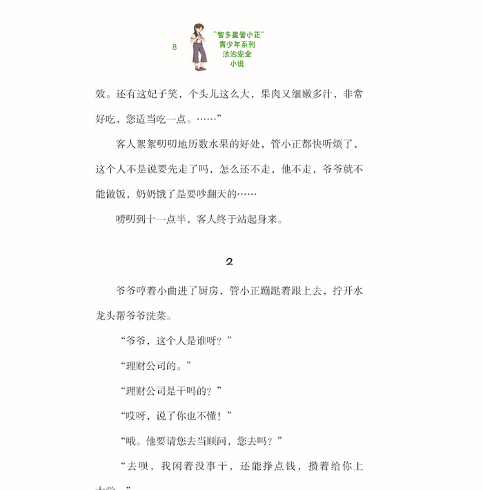所以,我写了这套书,希望能给你们一些启发:这套书写的 是暑假期间一个男孩管小正、两个女孩小麦和小米、一只叫然鹅 的白天鹅在马儿多农场遇到的一系列惊险事件。我在这套书里准 备了十多个侦探故事以及相关的法律条文。怎么样,听起来很有 意思吧!