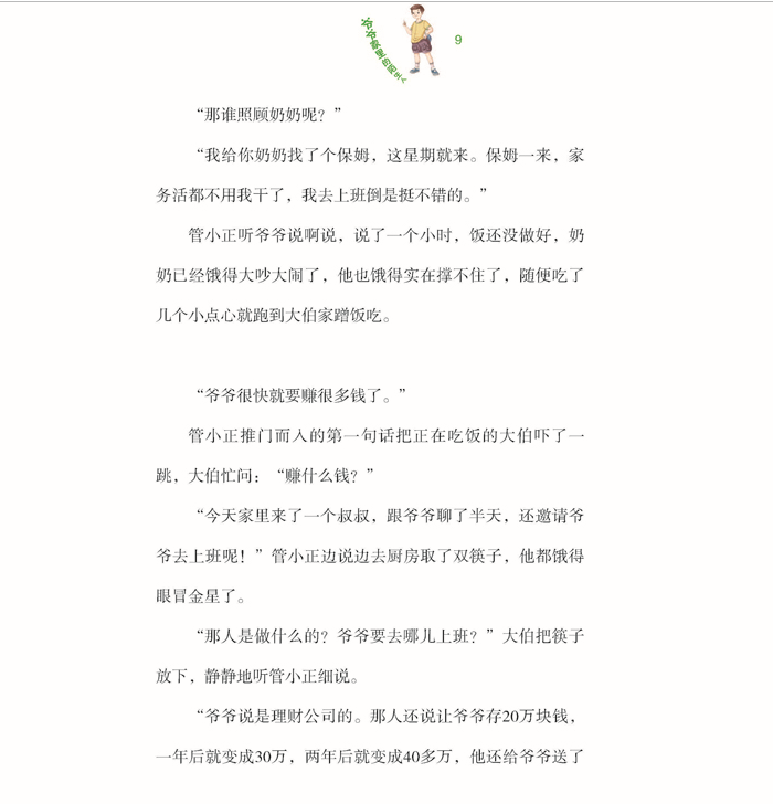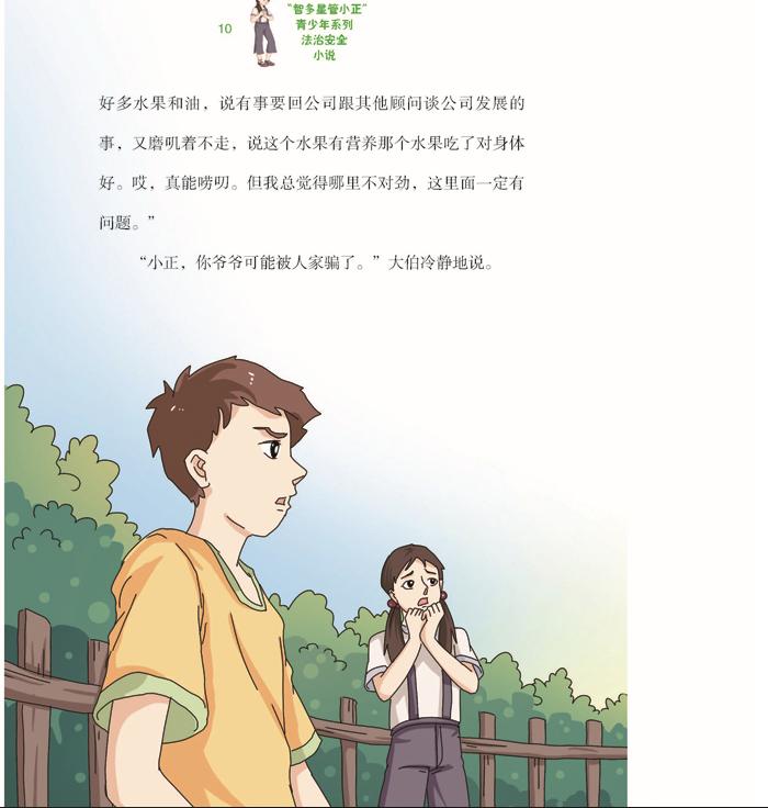 本册书讲述了:管小正来到爷爷家开始快乐的暑假生活,这时爷爷家来了奇怪的陌生人,不断向爷爷推销各种古怪的保健品以及一些荒诞的食疗方法,这些引起了小正的怀疑。小正通过在网上查找信息、咨询相关专家以及与警察叔叔配合,将一帮专门欺骗老年消费者的兜售非正规保健品的团伙一网打尽。爷爷从此对活泼淘气的小孙子也刮目相看了......