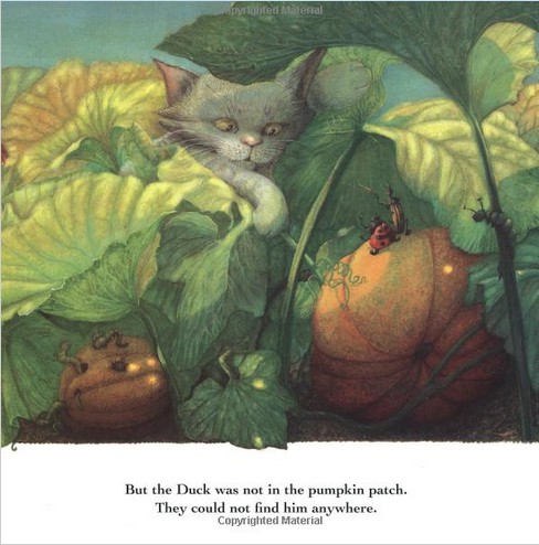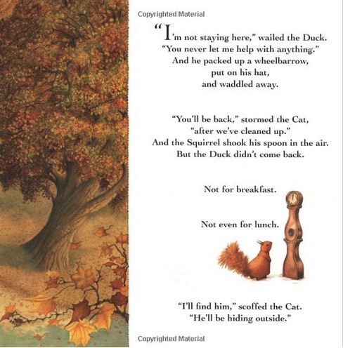There is something so warm, satisfying and homey about this book. The three animals live happily together in their warm and cozy house eating their regular supper of pumpkin soup. Each member of this little family has his own role in the soup making process; however, happiness cannot last forever and one morning the duck decides he wants to trade parts! HE wants to be the one stirring the soup... This wish causes chaos in the little house and the duck decides to leave....