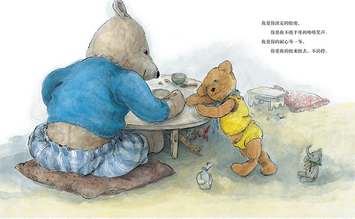 简单的押韵诗配上温馨的水彩插图,勾勒出熊爸爸和熊宝宝生活中的一天。俏皮的对话和开心的游戏,充满了父母和孩子之间无限的爱。