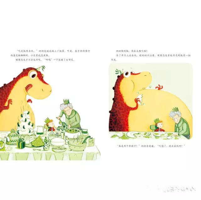 丹尼和便便恐龙为了早点儿出去玩,他们快速的吃了一顿丰盛但很难吃的西兰花大餐,