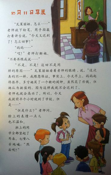 这天早上,当瓦莱丽娅走进教室的时候,铃声已经响起,她又迟到了!跟她一块儿来到教室的人有:校长、校工、门卫、秘书......他们跟老师和同学一样,都在满心期待地等着听瓦莱丽娅讲她迟到的原因......