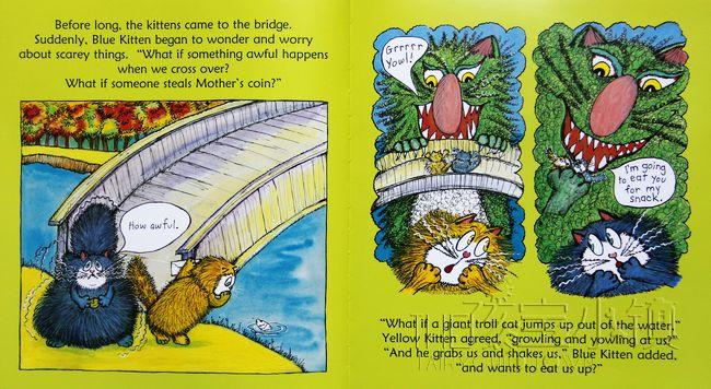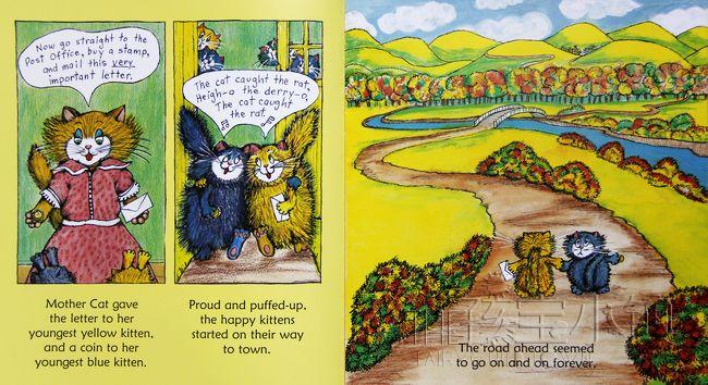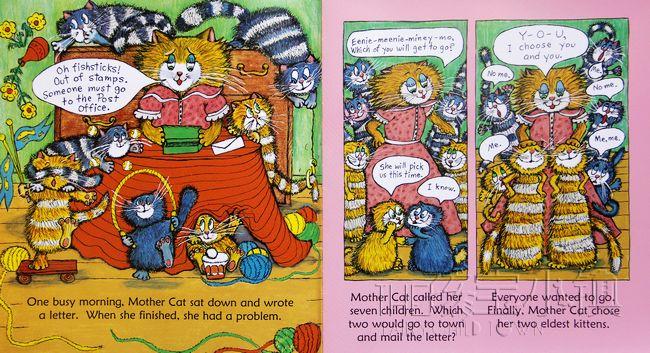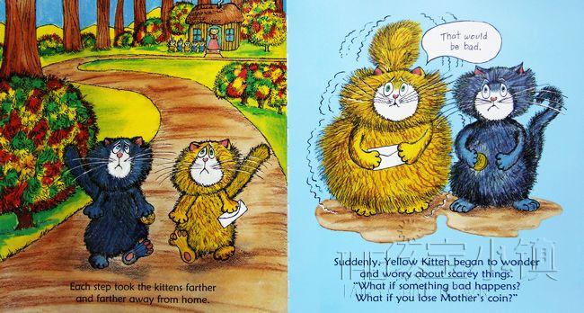 猫妈妈要寄信,却发现没有邮票了,于是她要派两只小猫送信到镇上的邮局。她的七个孩子都争着要帮忙跑腿,最后妈妈选了年纪最小的小蓝猫和小黄猫。这是他们第一次在没有妈妈的陪伴下出远门,一开始,小蓝和小黄非常兴奋,但走着走着,他们的脑海里就冒出了一堆恐怖的幻想..... ..到底小蓝和小黄能不能顺利完成他们的首次跑腿任务呢?故事结合了现实中的生活经验与小朋友特有的奇妙幻想,也生动地描绘出小朋友的情绪转折和细微感受,让人联想到日本作家筒井赖子和林明子合作的经典绘本《第一次上街买东西》。