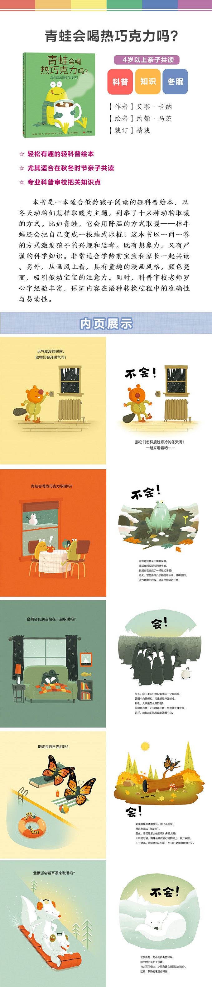 到了寒冷的季节,动物是怎么取暖的呢? 比如青蛙,它会喝热巧克力来取暖吗? 答案当然是:青蛙不会喝热巧克力,有的青蛙——比如林牛蛙还会把自己变成一根蛙式冰棍! 那北极熊妈妈会盖房子吗?企鹅、原驼呢…… 一问一答的方式激发孩子的兴趣和思考。 每一个对页中,左侧页面是想象中的取暖方式,右侧页面是实际的取暖方式。 用Q&A的方式揭秘动物取暖的秘密! 为什么会创作这本书?——因为作者的取暖方式就很独特——跳舞!