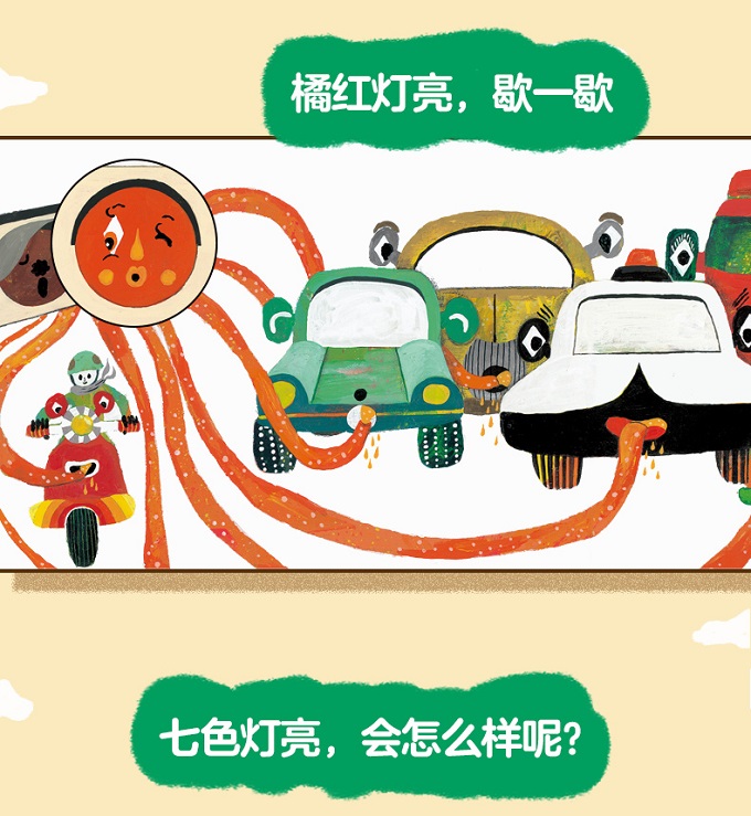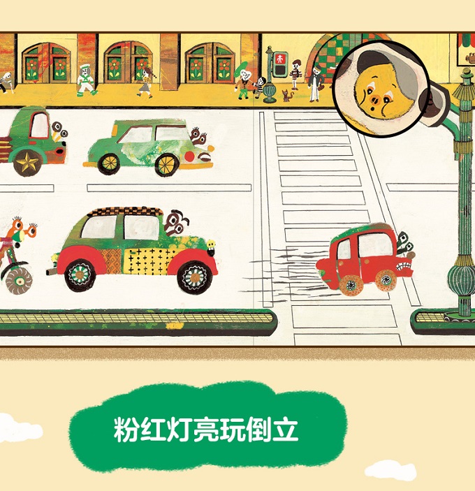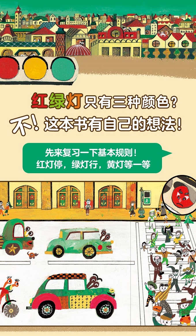 作者小木屋工坊是一对才华横溢的年轻创作组合,不仅创作绘本,也活跃于绘画、立体装置等领域。他们的创作风格散发着独特的诙谐幽默、天马行空的气质,这一点从《红绿灯,变变变》一书中也能看出。《红绿灯,变变变》的故事舞台是街道,幽默逗趣的角色形象、设计独特的汽车、散发着异国风情的街景,让人产生了置身异国他乡的新奇感。尤其是形态各异的车子,一定能让小车迷们看得目不转睛,车身上有着迷人的花纹,连轮胎都富有细节设计,不过小朋友还是可以根据车子的造型,推测出它们都是什么车。 不过,最让人产生新奇感的是绘本的内容,除了常见的红黄绿色的信号灯,作者还设计出了新的信号灯,并赋予了它们不同的意义:粉红灯亮,玩倒立;草绿灯亮,跳一跳;橘红灯亮,歇一歇;紫灯亮,赶紧逃……情节的展开令人出乎意料,作者打破了固有观念,让红绿灯有了五彩缤纷的色彩!绘本的立意也走向了一个新的高度:大胆的想象,让世界变得更加丰富有趣。绘本的结尾也令人倍感安心,在一场天马行空的想象后,告诉孩子们说:过马路的时候,一定要确认好红绿灯,认真遵守交通规则哟,融入了思想上要开放自由,行动上要回归现实的思想。作者深谙绘本的创作节奏,有放有收,创作出了一部充满童趣的作品。