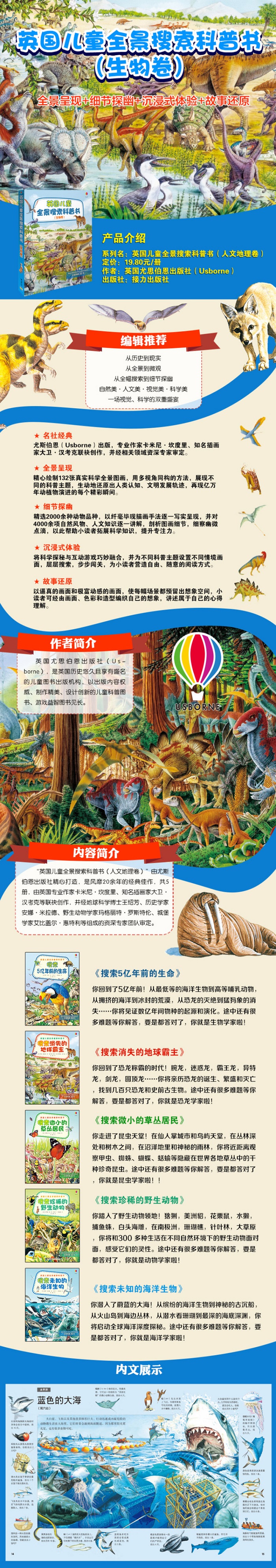这是一套很有特色的儿童科普图书,在阅读的过程中激活孩子的想像力。好奇心引领孩子畅游在恐龙、海洋、昆虫、人类历史等科学知识的海洋中,沿着横向或纵向的时空顺序,进入一个个脉络清晰、内涵丰富的科学世界。作者不拘泥于科学知识的传播,更倾向于激发孩子对科学的思考和热情,培养孩子的创造力。 ——本丛书审定者、地球科学专家——王绍芳博士 英国儿童全景搜索科普书,从历史到现实,从全景到微观,从全幅搜索到细节探幽, 兼具自然美·人文美·视觉美·科学美,带给孩子一场视觉、科学的双重盛宴。 ★ 名社经典——本丛书是世界著名出版机构尤斯伯恩(Usborne)优质美绘科普书,风靡20余年,由专业作家卡米尼·坎度里、知名插画家大卫·汉考克联袂创作,并经资深专家审定。 ★ 全景呈现——本丛书精心绘制132张真实科学全景图画,依照主题,逐一分类,用多视角同构的方法,展现不同的科普主题,生动地还原出人类认知、文明发展轨迹,再现亿万年动动植物演进的每个精彩瞬间。 ★ 细节探幽——本丛书精选2000余种动物品种,以纤毫毕现描画手法逐一写实呈现,并对4000余项自然风物、人文知识逐一讲解,剖析图画细节读,细察幽微点滴,以此帮助小读者拓展科学知识,提升专注力。 ★ 沉浸式体验——本丛书将科学探秘与互动游戏巧妙融合,并为不同科普主题设置不同情境画面,层层搜索,步步闯关,为小读者营造自由、随意的阅读方式。 ★ 故事还原——本丛书以逼真的画面和极富动感的画面组织,使每幅场景都预留出想象空间,小读者可经由画面、色彩和造型编织自己的想象,可以讲述自己的心得、理解和猜测。
