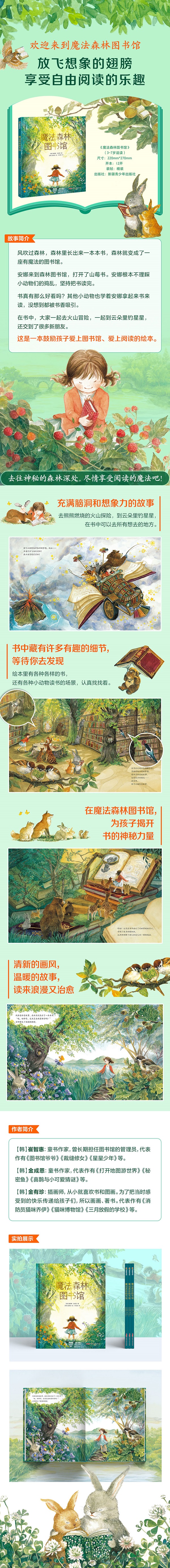 去往神秘的森林深处,尽情享受阅读的魔法吧! 充满脑洞和想象力的故事。去熊熊燃烧的火山探险,到云朵里钓星星,在书中可以去所有想去的地方。 书中藏有许多有趣的细节,等待你去发现。绘本里有各种各样的书,还有各种小动物读书的场景,认真找找看。 一本鼓励孩子爱上图书馆、爱上阅读的绘本。让孩子沉浸在书中,在温馨的氛围中体味到读书的自由和愉悦。 在魔法森林图书馆,为孩子揭开书的神秘力量。 清新的画风,温暖的故事,读来浪漫又治愈。