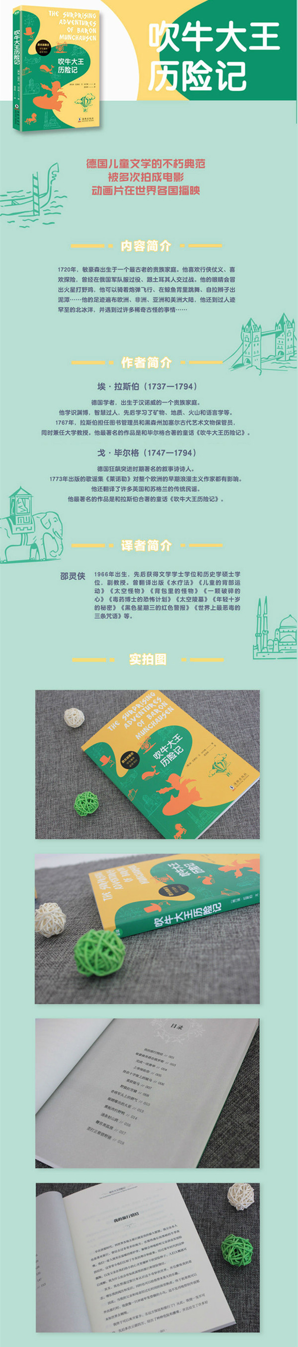 他讲的故事惊险奇特,风趣幽默,令人难以置信又痴迷不已。在这些故事中,敏豪森男爵总是能巧妙地化解旅行途中遭遇的凶险。他经常在故事的末尾感叹,面对困难要开动脑筋,找到处理问题的*方式方法,因为勇气和智慧会带给我们无穷的精神力量。