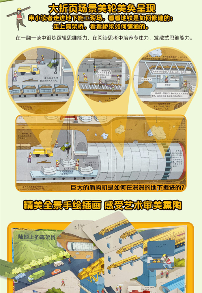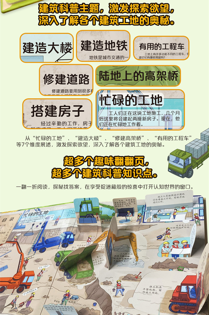 忙碌的工地上,各种建筑机械隆隆的轰鸣着,各种巨型的设备,还有各种神秘的施工过程,令无数的孩子为之着迷。本书就是为了满足好奇的孩子精心制作而成,通过忙碌的工地、搭建房子、建造大楼、修建道路、建造地铁,以及有用的工程车等多个角度,全面展示了各种建筑工地的全景。本书通过翻翻页的有趣形式,充满童趣的画风,知识丰富,生动幽默,带领小读者踏上揭秘探索之旅。