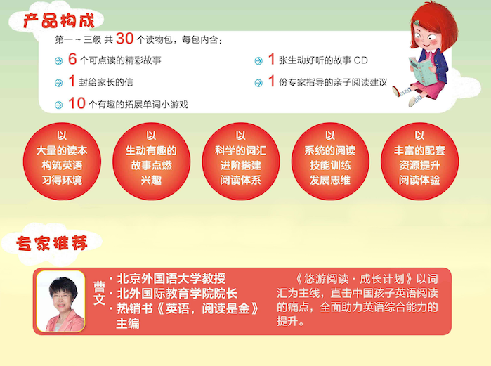 悠游阅读·成长计划(ReadingJourney)是外研社专为培养中国儿童英语阅读能力而设计编写的一套大型原创英语分级读物,由近百名欧美专业作者联合创作。 本套分级读物以二语习得理论为指导,以词汇习得为特色,从英语零起点开始规划,为孩子提供大量的、可理解性的语言输入。 依据科学的词汇进阶而搭建的阅读体系,让孩子在轻松愉悦的阅读体验中,从积累听力词汇开始,继而高效学习自然拼读,逐步顺利进阶至桥梁书、章节书,*终能够自主、自信地阅读英文原版书。 该系列读物兼具科学性、系统性和趣味性,涵盖大量孩子感兴趣的话题和主题,故事精彩有趣,插图精美可爱,同时提供完整的阅读策略和技能培养方案,能*程度地激发孩子的阅读兴趣和表达欲望,并逐步发展批判性思维和创新思维能力。 该系列读物配有音频、动画、点读功能及移动端应用,让孩子拥有全方位的立体阅读体验,在快乐中阅读,在阅读中获取新知。