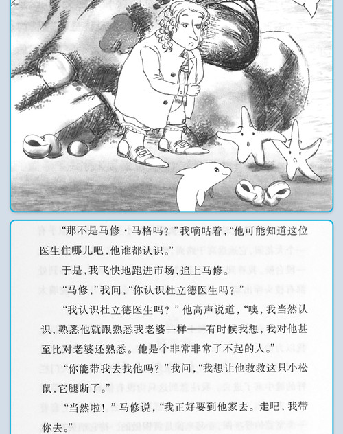 ★1923年纽伯瑞儿童文学金奖 ★被誉为《爱丽丝漫游奇境记》之后*部真正的儿童文学经典 ★被亚马逊书店评为20世纪50本*童书 ★入选美国中小学生***书目 ★畅销不衰,翻译成各国文字,不断再版,一再被拍成电影的动物传奇故事 ★生动的故事,有趣的动物角色,引导孩子关爱保护动物,与大自然和谐相处 《杜立德医生航海记》讲述了关于善良和互助的故事。杜立德医生带着老狗吉布、鹦鹉波丽、猴子奇奇,还有小助手汤米出海远航,遭遇了许多不可思议的事情。庄严的法庭上,出庭作证的竟是一只狗,杜立德医生是如何帮助他们洗脱嫌疑,力证清白?热带海岛蜘蛛猴岛是一座浮岛,眼看就要漂到严寒的南极,杜立德医生又是如何拯救这座小岛,帮助岛上生物摆脱危机……让我们跟随杜立德医生一起经历这些惊险有趣的奇幻之旅吧!
