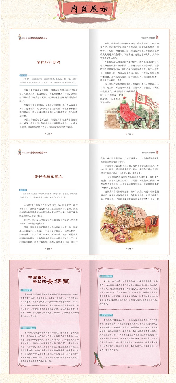 《中国古代名将故事》一书中,按历史发展顺序编写,在保留历史真实的情况下,尽量避免冗长的叙述,采用富有启发性的故事来传达古代著名将领展现出来的智慧和哲理,侧重的是书中人物对孩子人生观、世界观的影响。让孩子学会从古代名将的经历中吸取教训,让他们怀着一颗善良的心做人做事。内容让孩子从有温度的古代人物故事中,走入历史现场,给孩子一次人文和历史启蒙。对孩子奠定一生的国学基础和树立正确的价值观,有着独特的价值。