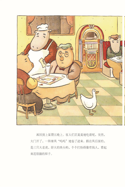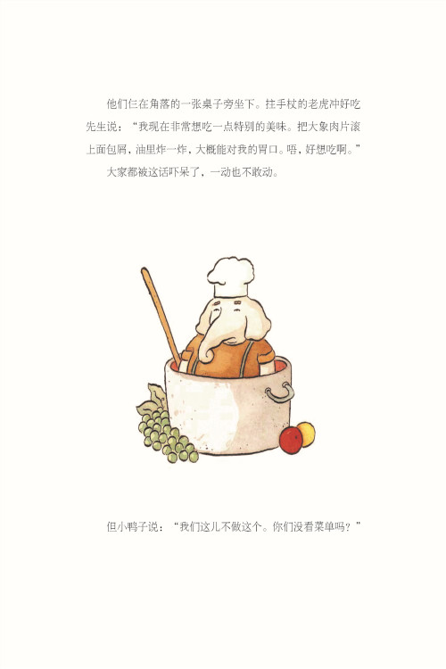 大胆和幽默,有时候就是化解危机*好的武器。这样的讯息怎么传达给孩子呢?翻开这本《三只老虎战小鸭》,天啊,这只鸭子不要命了吗?竟然敢跟大老虎呛声。当餐厅里的其他客人都吓得突然变成了化石似的、动也不敢动时,小鸭子不仅不怕自己变成老虎的桌上肉,竟说:“我们这里没有这些食物。你们没看菜单吗?”哈哈哈哈哈,我只能说,这本绘本的作者真是太厉害了。