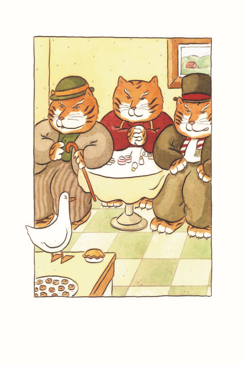 但小鸭子不动声色地踢起一只杏仁蛋糕,抄起一盘焦糖小蛋糕,向老虎们扔去。