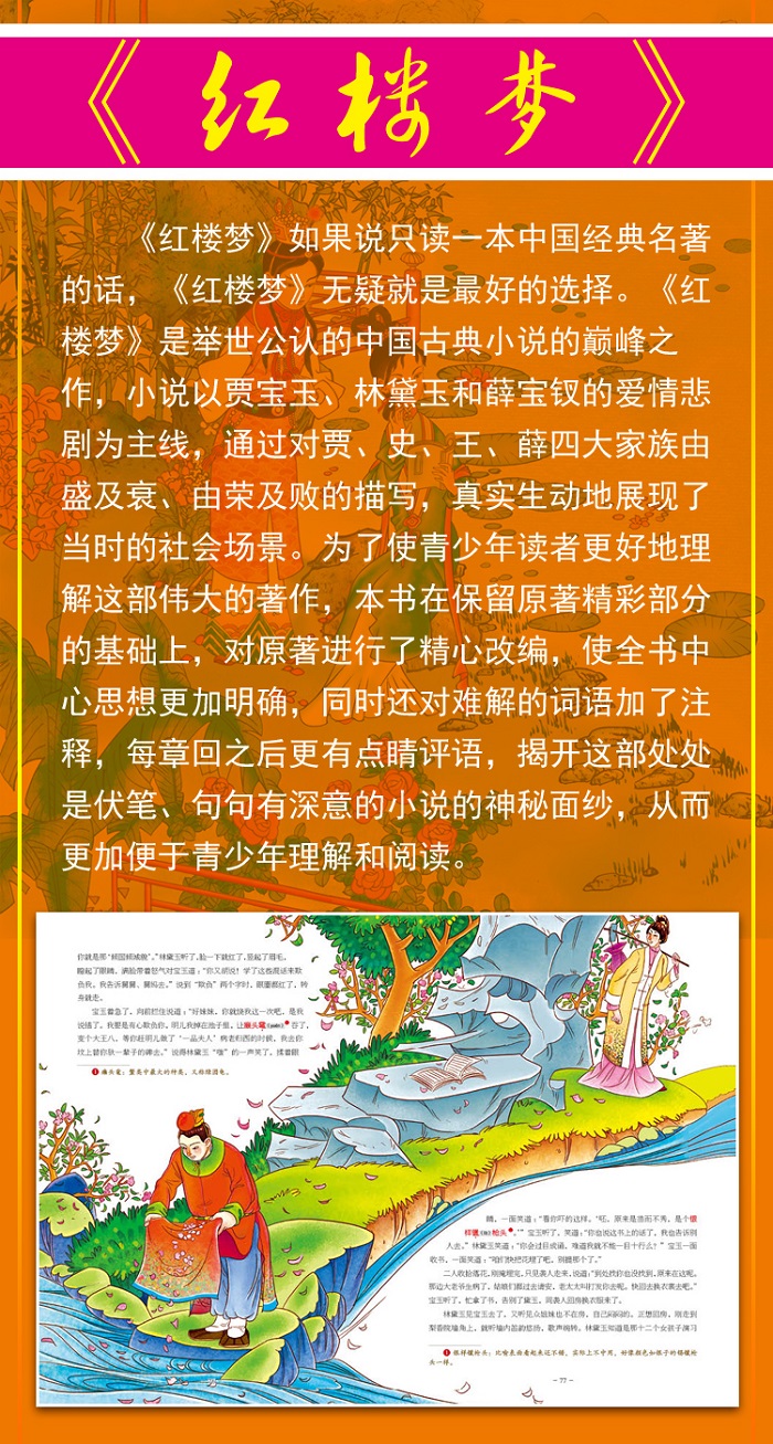 《红楼梦》的艺术结构独具匠心,语言生动优美,人物形象个性鲜明。最令人惊叹的艺术成就,首先表现在人物形象的塑造上,它创造了众多个性鲜明内涵丰富的人物形象:性格叛逆、行为怪僻而乖张的“混世魔王”贾宝玉;才华横溢、生性孤傲、天真率直、蔑视功名权贵的“病西施”林黛玉;容貌美丽、举止娴雅、品格端方、八面玲珑,热衷于“仕途经济”的“冷美人”薛宝钗;弄权作势、两面三刀、精明强干,极度贪婪的“凤辣子”王熙凤……这些令人难忘的人物形象的性格色调是那样鲜明、不可更易。其次,《红楼梦》的语言特色,主要表现为晓畅、洗练极富表现力。它晓畅而不流于浅露,洗练却又无刻削之痕。至于它的表现力,也不是呈现于辞句的表面,而是常常深含在内里,使人能领略到它语言的美妙和神韵。