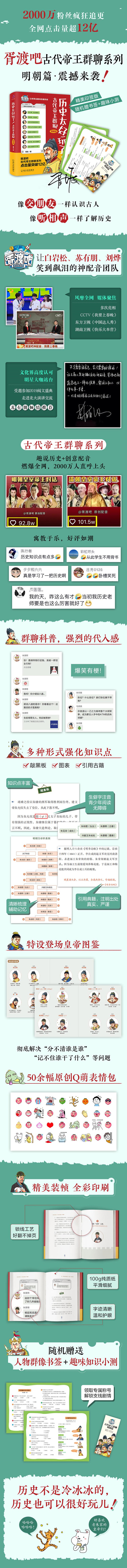 如果每个朝代的帝王都有家族群,他们会在群里聊些什么? 明朝十六帝齐聚一群!白手起家的朱元璋见到了亡国皇帝朱由检,能征善战的朱棣见到了断送大明军事力量的朱祁镇,只娶了一个老婆的朱祐樘见到了作风“不检点”的儿子朱厚照,深情皇帝朱见深执意要邀请“妖妃”万氏进群……场面一度非常混乱。在明朝家族群中,互掐互“怼”少不了,澄清辩白是日常,更有当事人亲自讲述“壬寅宫变”“梃击案”“红丸案”“移宫案”等宫廷秘案,可以说,一本“聊天记录”,就是一部有趣的大明史。 本书用幽默诙谐的语言,个性有趣的头像为历史人物注入灵魂,遥远的古人与我们不再有距离感,使得看似晦涩的历史知识变得鲜活生动。阅读此书,我们可以像交朋友一样结识古人,像听相声一样了解历史。