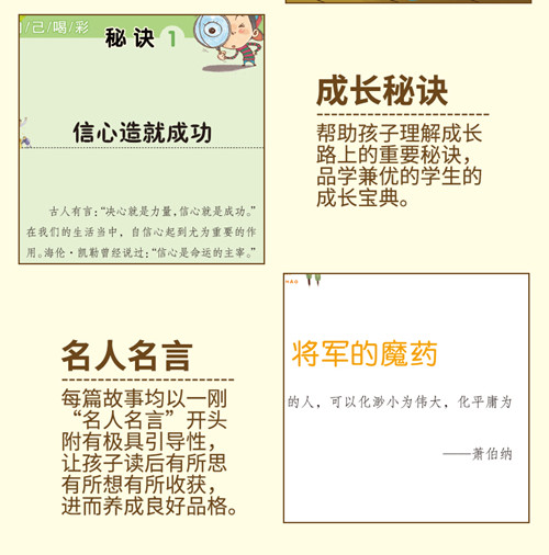 这是一套基于小学生学习成长中的常见问题,以解决问题为目的,以启发引导为方法,编写的故事书。针对习惯养成、情绪管理、人际交往、学习方法、情商培养、逆商培养、爱心培养等方面的10个显著问题,包括:再见了,坏习惯,我要努力当学霸,我能管好我自己,做个受欢迎的人,面对困难我不怕,我要为自己喝彩,不把父母当佣人,战胜拖拉我能行,目标让我有动力,分享让我变快乐。选取简洁、生动、有趣的故事,加以一针见血的评点剖析,让孩子从故事里可以获得成长的启示,得到美的熏陶、爱的润泽、智慧之光的照耀,给孩子送去温暖和信心,同时帮助孩子解决生活中、学习中可能遭遇的烦恼和迷茫,从而调整自己的情绪与心灵状态。