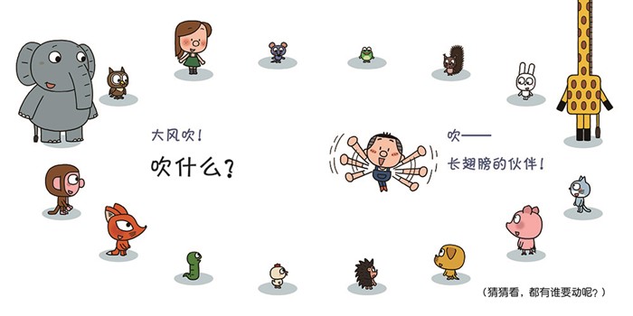 游戏规则很简单!每一轮都有一个小朋友充当风神,具备风神提问的特点的小朋友们就要跑动起来。爸爸妈妈们在和小朋友读这本书时可以先不着急翻下一页,请孩子们根据“风神”的动作提示都猜一猜:麦麦的手臂挥舞得这么快,会吹什么样的小伙伴呢?小鸡翘起了尾巴,会吹什么样的小伙伴呢?小狗伸长了手臂,会吹什么样的小伙伴呢?大象垂头丧气的,会吹什么样的小伙伴呢?