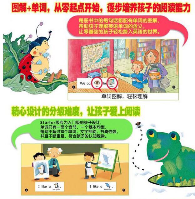 精心设计的分级难度,从零起点开始,逐步培养孩子的阅读能力。每级在词汇引入方面的严格控制,单词只有一两个音节,一个基本句型,每句不