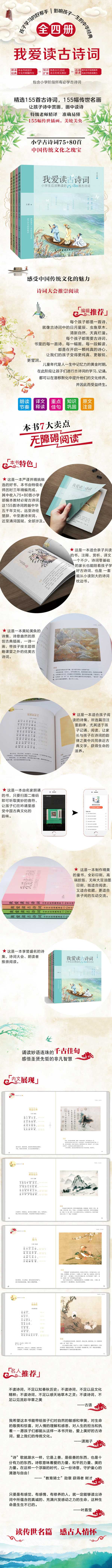 本书共四卷,从孩子的认知能力、阅读能力、阅读兴趣出发,精选了涵盖诗经、古诗十九首、唐诗、宋词等经典诗词,以通俗易懂的解析、好玩有趣的品读、体贴入微的注释,让孩子增长阅读兴趣,体悟人生智慧,领略大师文采,体验不同的感受,并提高写作文的能力,提高语文水平,既怡情,又实用,让让孩子受益一生。